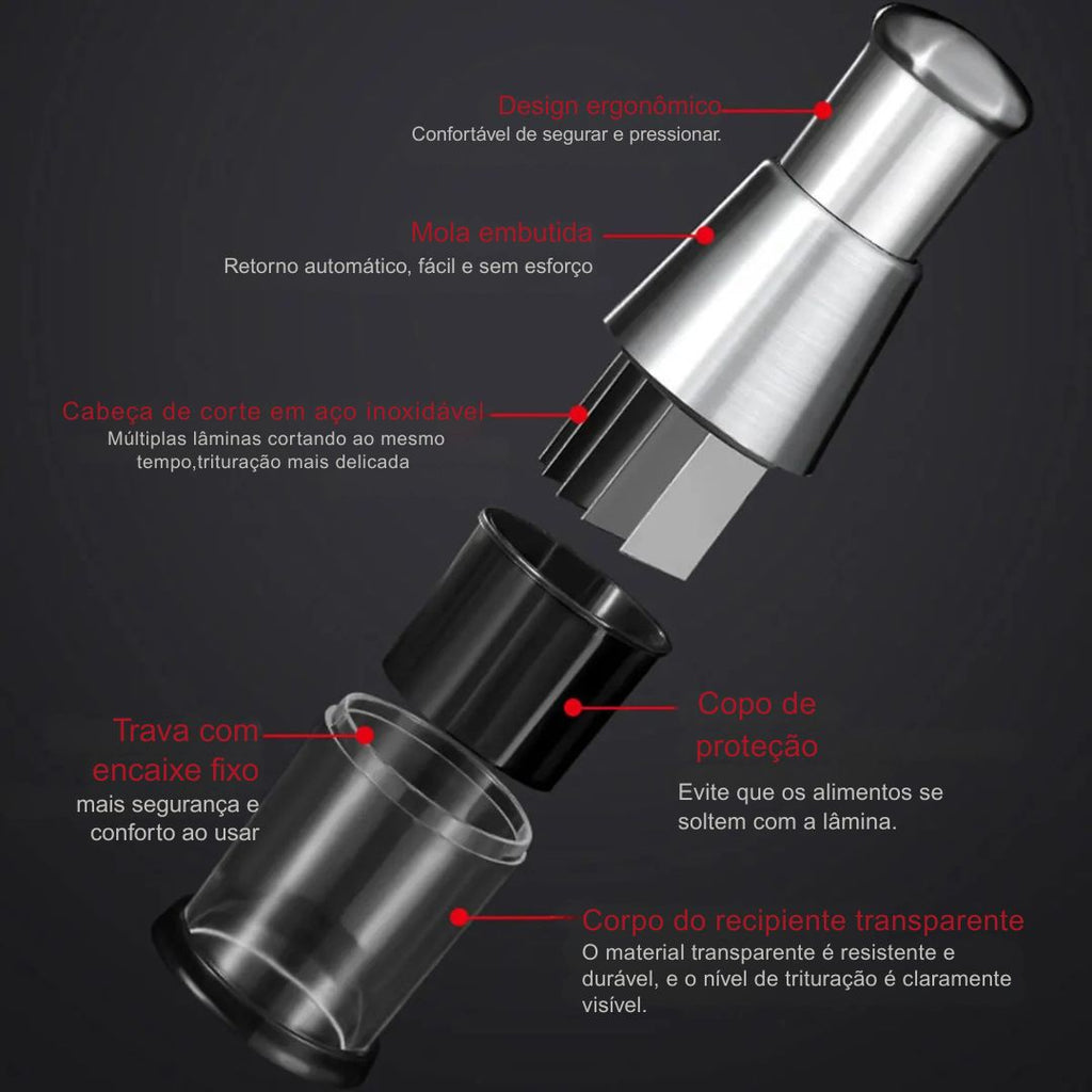• Multifuncional: ideal para alho, cebola, gengibre, pimenta e até amendoins